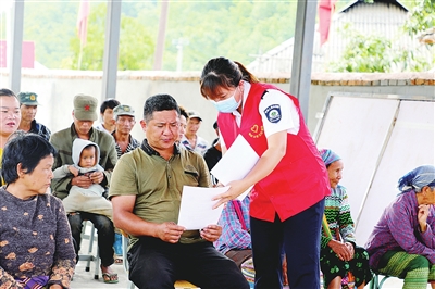 宣讲团志愿者通过现场宣讲、发放宣传资料、一对一解疑等方式,讲解健康生活的意义、卫生常识等,并挨家挨户张贴以爱国、法治、文明等为内容的宣传海报,帮助贫困村民摆脱思想贫困、精神贫困。