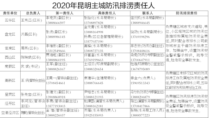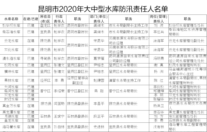 今年汛期,为进一步贯彻落实防汛工作各级人民政府行政首长负责制为核心的各项责任制,根据《中华人民共和国防洪法》《云南省防洪条例》有关规定,并结合昆明市实际,市防汛抗旱指挥部将昆明市2020年主要江河、湖泊、重要城市、大中型水库防汛工作责任人予以公布明确,要求每座水库都有专人巡查防守,一旦出险及时发布预警信息,及时转移危险区域人员,及时抢护处置险情。