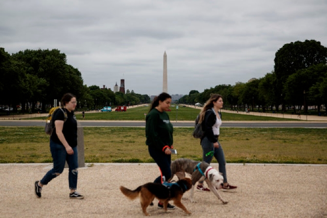 5月18日,人们在美国首都华盛顿国家广场散步、遛狗。美国约翰斯·霍普金斯大学18日发布的新冠疫情最新统计数据显示,美国累计新冠确诊病例超过150万例。新华社发(沈霆摄)