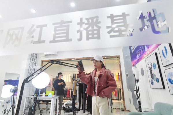 3月28日,中山沙溪镇的一位服装主播在直播带货。为尽快走出疫情影响和推动经济高质量发展,首届时尚沙溪3·28直播节暨沙溪休闲服装网络特卖会在该镇淘宝直播基地举行,沙溪镇党政领导也上阵客串主播带货,积极推广该镇休闲服装产业的电子商务发展创新模式。 新华社记者 刘大伟 摄