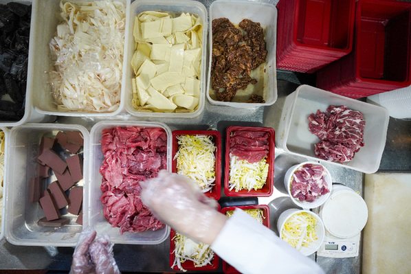3月13日,在重庆小天鹅火锅标准化生鲜火锅外卖的门店内,后厨的工作人员为生鲜火锅外卖订单备菜。疫情期间,在“火锅之都”重庆,当地通过线上点单、“零接触”配送等方式,让老百姓在家里也能吃上热腾腾的火锅。