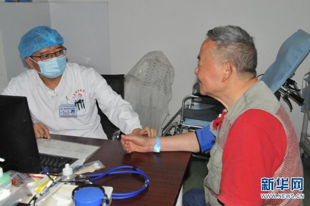 5月19日,谢健(左)在门诊给患者看病。(新华社记者姚兵 摄)