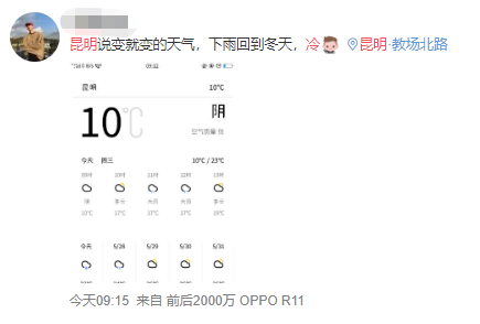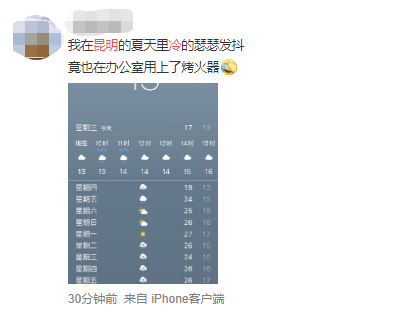昆明昨天的最高气温为18.8℃,较前一天下降了6.5℃,今晨8时,气温只有11.1℃,配合着阴沉的天空,寒意明显。