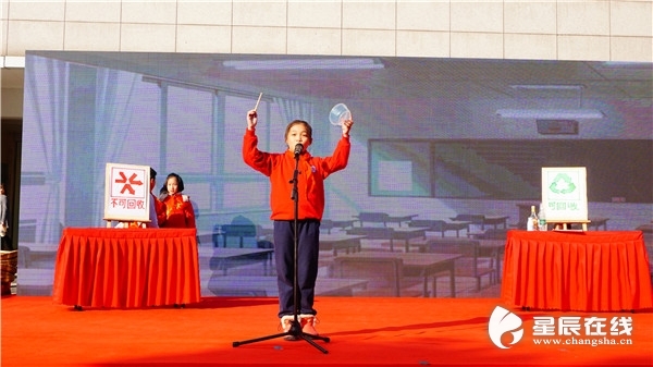 (芙蓉区燕山小学的学生带来情景剧表演,传播垃圾分类知识。通讯员 曹晶 摄)