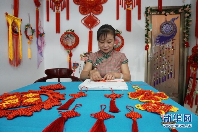 5月21日,天津市河北区非物质文化遗产项目“巧妹红妆绳艺”代表性传承人吕敏在工作室里编织中国结。新华社记者 栗雅婷 摄