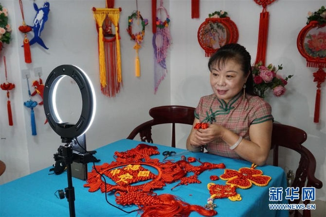 5月21日,天津市河北区非物质文化遗产项目“巧妹红妆绳艺”代表性传承人吕敏在工作室里直播编织中国结。新华社记者 宋瑞 摄