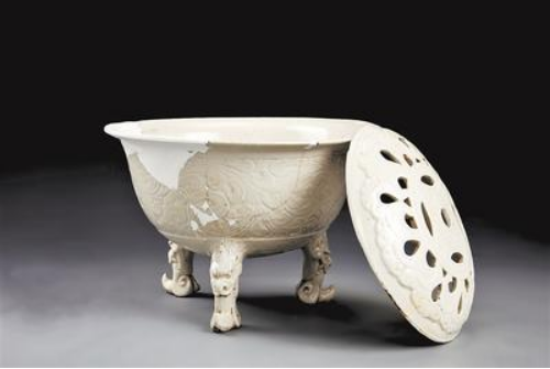 出土的金代白釉刻划花镂孔盖三螭足熏炉。省文物考古研究院供图