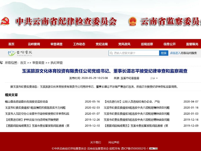 玉溪旅游文化体育投资有限责任公司党组书记、董事长谭志平被查