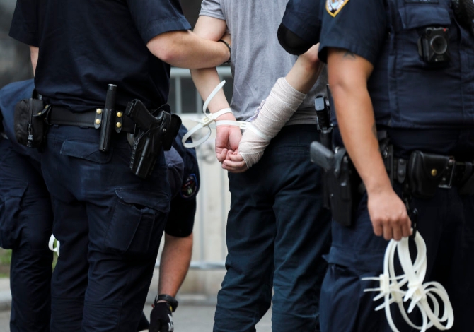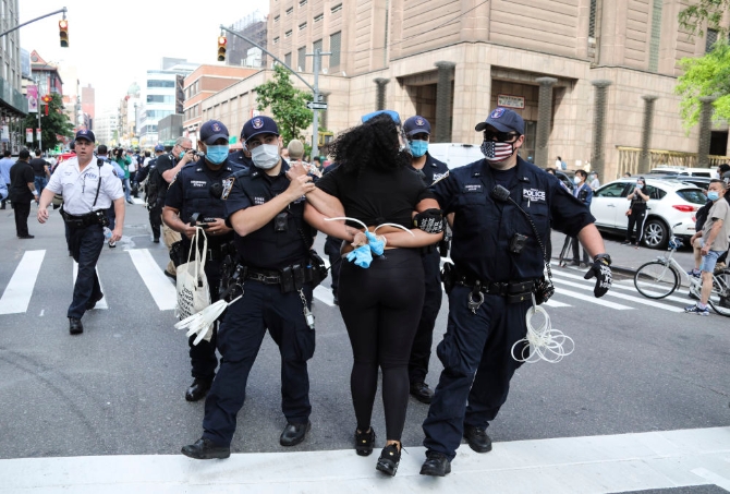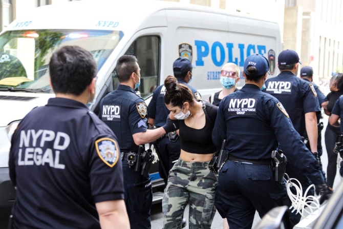 ↑5月29日,在美国纽约,警察逮捕一名抗议者。