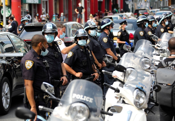 ↑5月29日,在美国纽约,警察在抗议者附近警戒。