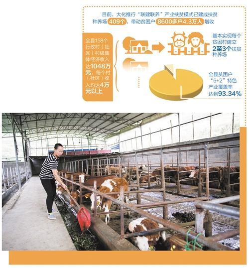 “胜利村弄代肉牛扶贫养殖场去年底出栏了44头西门塔尔肉牛。按公司协议保价回收,入股的109户贫困户,扣除持续发展本金后,每户得到入股分红1000元。”胜利村驻村第一书记王晖说:“‘联建联养’扶贫种养场让群众有了‘长期粮票’,去年全村443户2445人实现脱贫,贫困发生率降到了36.32%。”(经济日报)