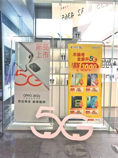 为吸引更多4G用户升级5G网络,配合众多手机厂商推出的各款中端新机,运营商还打出了以现金返还减免话费的优惠策略。在OPPO手机专卖店里,工作人员陈小姐告诉记者,5月初才上市的A92是目前OPPO价格最低的5G手机,内存6GB版本标价2299元:“店里最受欢迎的5G手机是Reno3,原价2999元,运营商有500元的5G套餐优惠,到手价就是2499元。”