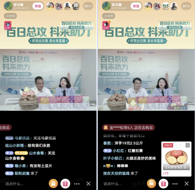 5月29日至31日,“百日总攻·抖来助力”大型直播宣传推介活动期间,“云直播”吸引了云南5个州(市)的7个深度贫困县的县级领导走进抖音直播间,推介当地特色农产品,助力脱贫攻坚。