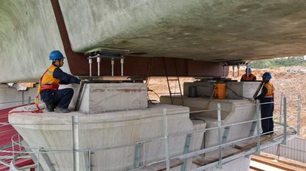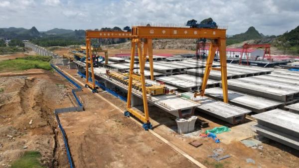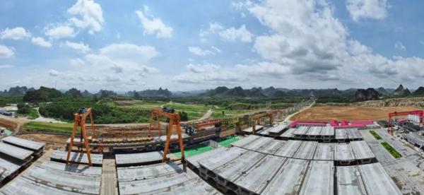 6月2日11时,在贵南高铁广西段伊岭岩双线特大桥箱梁架设现场,一榀长32.6米、重900吨的简支箱梁被吊装到指定桥墩的预接孔内,标志着贵南高铁广西段南宁片区首榀箱梁成功架设。至此,贵南高铁广西段桥梁工程整体进度过半,贵南高铁离全线通车再进一步。