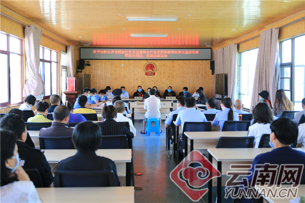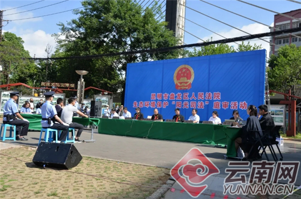 宣传周活动启动当天,昆明市中级人民法院首次联合辖区3家设有环境资源专业审判庭室的盘龙区人民法院、安宁市人民法院及寻甸县人民法院,分别在不同地点就4起涉环境资源刑事案件公开庭审,多名人大代表、政协委员、社会群众和媒体记者旁听了庭审。目前,4案均已当庭作出宣判。其中,在缓刑期间发现有收售濒危野生动物陆龟90余只的漏罪的钟某某,被盘龙法院撤销缓刑,本罪与前罪数罪并罚决定执行有期徒刑十四年并处罚金6万元,昆明中院二审当庭裁定驳回上诉,维持原判。安宁法院则对使用自制电鱼器在滇池水域非法捕捞水产品的赵某某判处拘役四个月,缓刑六个月;当天,赵某某向滇池水域增殖放流价值四千元的当地鱼苗。寻甸法院对使用高压气枪射杀国家二级保护野生动物灰鹤的张某某,判处有期徒刑一年,并处罚金6千元,涉案枪支予以没收,同时,赔偿涉案野生动物资源损失费5万元。盘龙区法院在昆明主城区广场在线直播了一起两被告人因排放未处理的强酸性废水污染环境获刑的刑事公益诉讼案,该案两被告人通过投放价值2万元的鱼苗进行替代性修改被破坏的生态,逾140万人在线收看了直播。