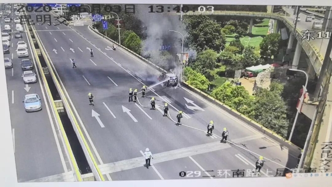 13时40分,在交警、消防部门的协调配合下,自燃车辆火势被扑灭,14时20分恢复正常交通。
