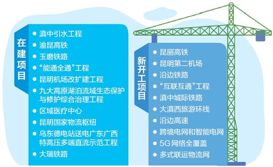 《方案》明确,在建项目包括滇中引水工程、渝昆高铁、玉磨铁路、“能通全通”工程、昆明机场改扩建工程、九大高原湖泊流域生态保护与修护综合治理工程、区域医疗中心、昆明国家物流枢纽、乌东德电站送电广东广西特高压多端直流示范工程、大瑞铁路;新开工项目包括昆丽高铁、昆明第二机场、沿边铁路、“互联互通”工程、滇中城际铁路、大滇西旅游环线、沿边高速、跨境电网和智能电网、5G网络全覆盖、多式联运物流网。