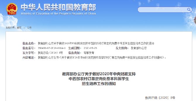 6月3日,教育部网站发布《教育部办公厅关于做好2020年中央财政支持中西部农村订单定向免费本科医学生招生培养工作的通知》。