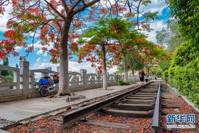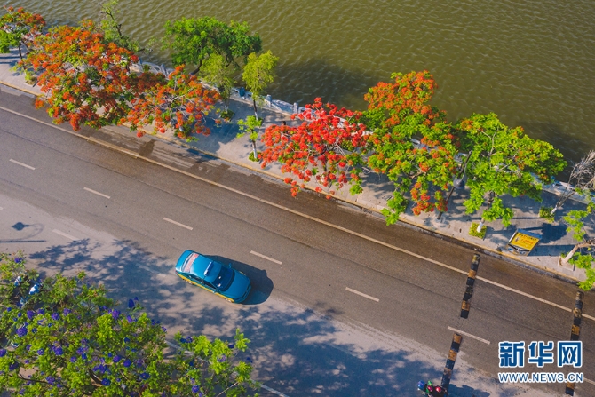 路旁的凤凰花竞相绽放(摄于5月29日)。新华网发(佴斌 摄)