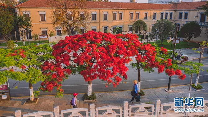 近日,在云南省红河哈尼族彝族自治州蒙自市,成千上万株凤凰花竞相绽放,锦簇花团红似火,灿烂热情。火红的凤凰花与城市建筑交相辉映,形成了一幅幅美丽壮观、鲜艳灿烂的景象。(张艳娥/文 佴斌/图)