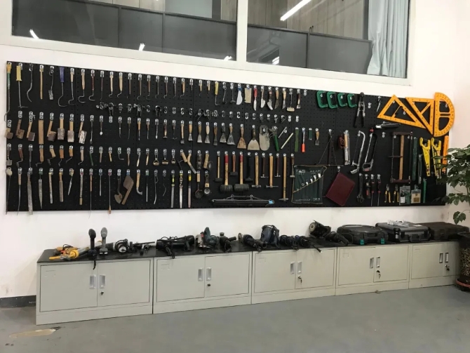 用电线管做成的固定工具、用牙刷做的刮胶用具、用绳子做成的纹饰成型工具、用切割片做成的拉缝工具……进入修复室,一面很大的工具墙跃然入眼,上面分门别类、由大到小地陈设着各式各样的工具。负责人董凯介绍说,这些工具多为张师傅亲手所做,修复中需要什么,他就利用手边的东西,随手做个工具。文物具有唯一性,修文物的工具也多有这个特性,很多工具都是仅用一次就不再用了。一块木板、一根铁丝、一个废旧的毛刷……在张师傅眼里,这都是宝贝。“这都用不了几分钟,很快的。马上需要马上做,马上做了马上就能用。”“见了就想修,修了就想修好,修好了就开心。”谈起自己的工作,他言语间满是自豪与掩不住的热爱。