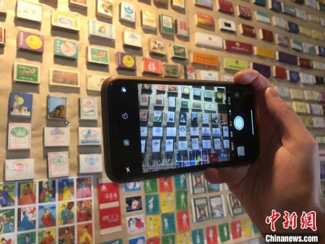 图为辛月收集的数百枚烟标火花展示。张婧 摄