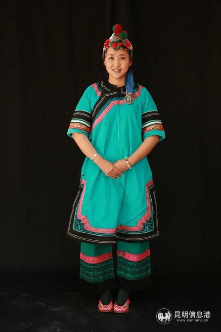 新娘头戴各色绒线球做成的高顶花帽,戴墨镜,身着两件长至膝盖外红内绿长衣,长衣的下摆及袖口由多层滚边和绣花图案组成。下身穿绿色直筒长裤,膝盖下绣有两圈绣花图案和喜鹊图,裤脚边绣花,脚穿绣花鞋。胸前挂镜子,有避邪之意。戴金、银链吊坠耳环,手戴金、银、玉等手镯。