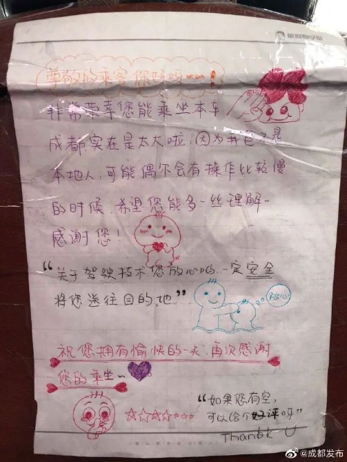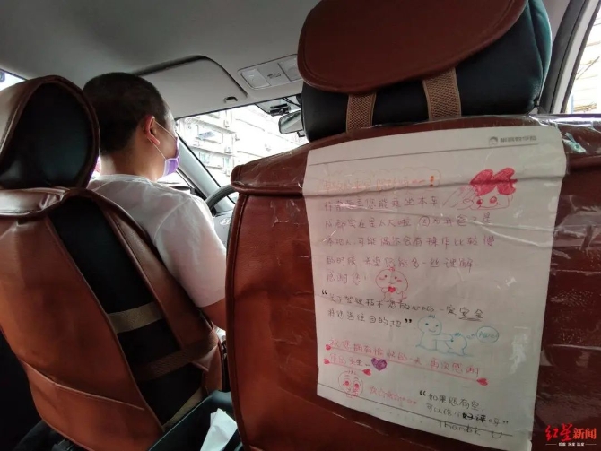 那张纸条就在副驾座后背上,用好几排透明胶贴得严严实实。字迹看得出很稚嫩,但一笔一画,写得十分整齐。短短100余字,还配有4幅小插画,用了5种颜色的笔。那4幅小插画,分别配合着文字,画的敬礼、比心、摸头、点赞。