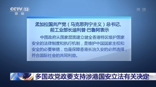 孟加拉国共产党(马克思列宁主义)总书记、前工业部长迪利普·巴鲁阿表示,中国政府从国家层面建立健全香港特区维护国家安全的法律制度和执行机制,是维护中国国家主权和安全的必要举措,也是保障香港长治久安的必然选择,符合国际社会的共同利益。
