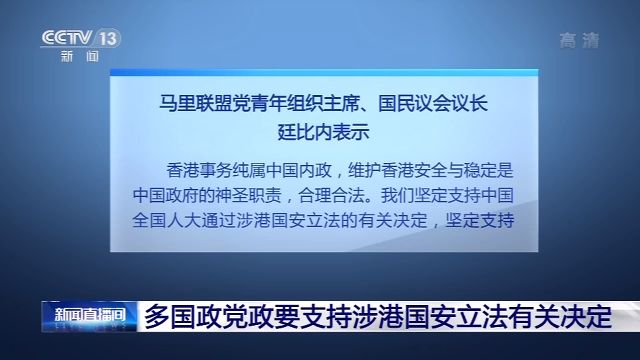 马里联盟党青年组织主席、国民议会议长廷比内表示,香港事务纯属中国内政,维护香港安全与稳定是中国政府的神圣职责,合理合法。我们坚定支持中国全国人大通过涉港国安立法的有关决定,坚定支持中国政府维护主权与安全的努力。任何外国势力无权干涉中国内部事务,更不能妄图利用香港问题破坏中国稳定、破坏“一国两制”。