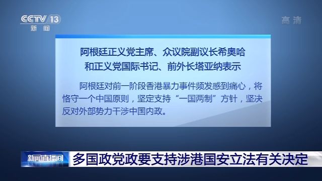 阿根廷正义党主席、众议院副议长希奥哈和正义党国际书记、前外长塔亚纳表示,阿根廷对前一阶段香港暴力事件频发感到痛心,将恪守一个中国原则,坚定支持“一国两制”方针,坚决反对外部势力干涉中国内政。