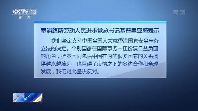 塞浦路斯劳动人民进步党总书记基普里亚努表示,我们坚定支持中国全国人大就香港国家安全事务立法的决定。个别国家在国际事务中正扮演日益负面的角色,把本国同包括中国在内的很多国家的关系搞得越来越疏远,也阻碍了疫情之下的多边合作和全球发展,我们对此坚决反对。(央视网)