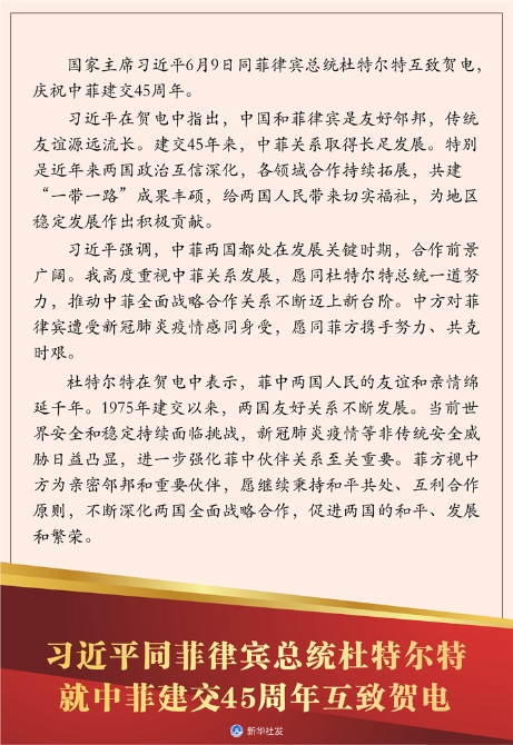 新华社北京6月9日电 国家主席习近平6月9日同菲律宾总统杜特尔特互致贺电,庆祝中菲建交45周年。