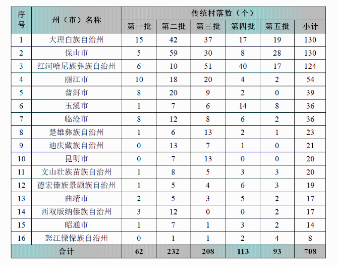 自2012年,云南启动中国传统村落申报工作以来,截至2019年底,经过7年五个批次的申报、认定和公布,云南共有708个村落入选中国传统村落名录,位居全国第二,数量占全国传统村落总数的10.47%。