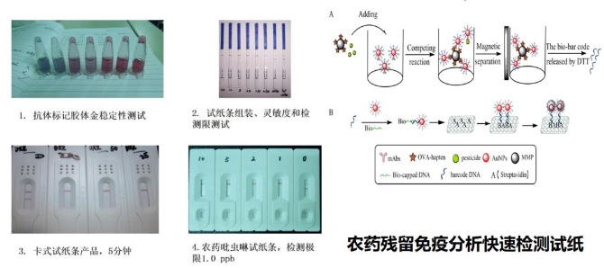 目前,团队研制了吡虫啉、克百威、戊唑醇、啶虫脒、腐霉利、毒死蜱、多菌灵等农药的胶体金快速检测试纸条,对试纸条加工参数进行了标准化,并使用条形码标识每一种试纸条的身份。为什么选择这几种农药做成试纸条呢?