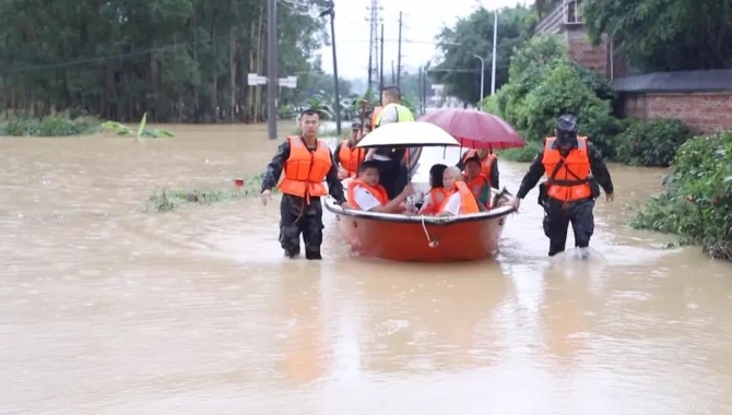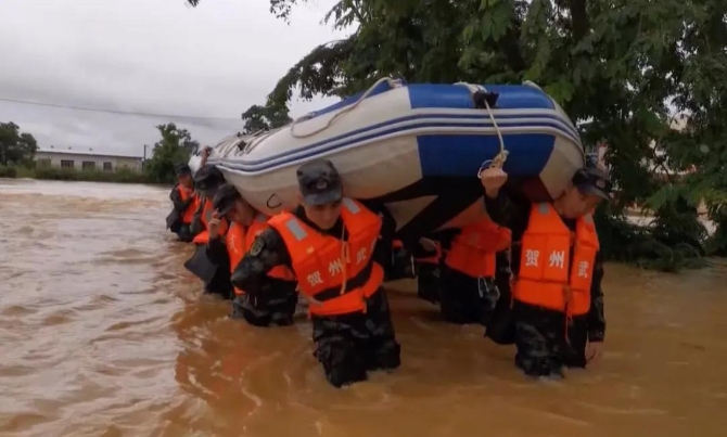 6月7日,桂林荔浦市马岭镇大面积受灾,有百余户居民被洪水围困。武警广西总队桂林支队官兵立即携带冲锋舟、皮划艇等救援器材奔赴荔浦受灾地域。