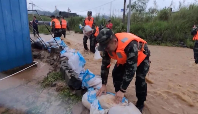 由于暴雨不断,河水漫堤,贺州市一取水供水点遭洪水冲击。武警官兵迅速携抢险物资赶赴现场,装填沙袋,建立防护屏障。