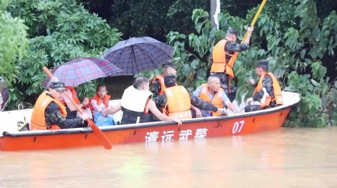 武警清远支队立即启动应急响应预案,31名官兵携带冲锋舟、救生衣等器材奔赴受灾现场。大家挨家挨户搜救被困居民,接力护送。