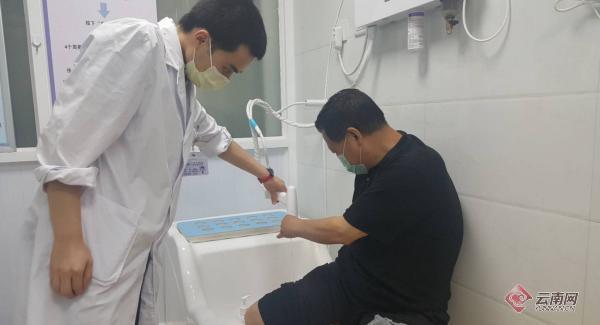 在医生的指导下,被狗咬伤的患者正在清洗伤口。 彭锡 摄