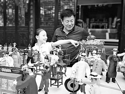 温州龙湾首届民俗文化节上,一对祖孙在观赏传统婚俗模型。陈贤宝摄/光明图片