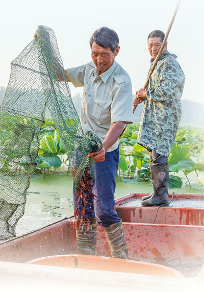 江苏省宿迁市宿城区中扬镇村民捕捞小龙虾。陆启辉摄(人民视觉)