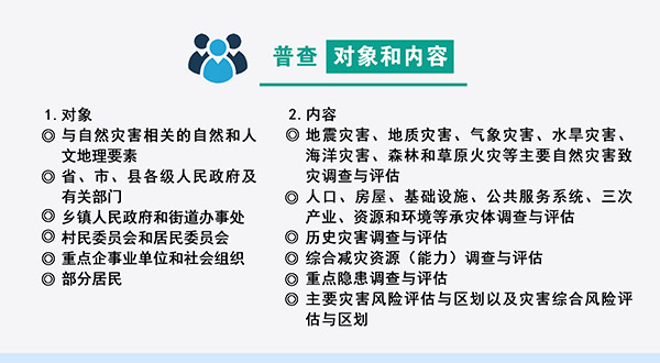一是聚焦于自然灾害风险的基本要素的底数调查。首先是自然灾害孕灾致灾要素的底数,即孕育和导致主要自然灾害发生发展的基本因素,主要自然灾害包括地震灾害、地质灾害、气象灾害、水旱灾害、海洋灾害、森林和草原火灾等。其次是重要承灾体的底数,即可能承受自然灾害打击的对象情况,也就是常说的人口、房屋建筑、基础设施、公共服务系统、资源与环境等,都是承灾体需要调查的对象。第三是历史自然灾害的底数,即历史上已发生的自然灾害情况,调查的对象既包括不同行政单元的年度自然灾害,也包括历史上发生的各类自然灾害事件详情,例如每场自然灾害的受灾面积、房屋倒损、经济损失等。通过普查,调查清楚自然灾害风险这几个方面的底数,获得自然灾害风险主要组成部分的详细信息,为开展主要自然灾害风险评估和综合风险评估以及防治区划制定奠定基础。