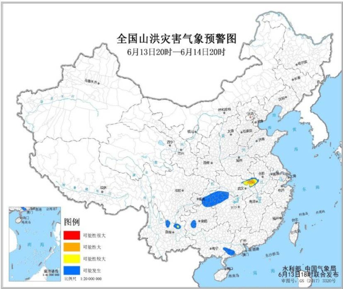 水利部和中国气象局6月13日18时联合发布山洪灾害气象预警,预计,6月13日20时至6月14日20时,河南南部、湖北东北部、安徽西部、云南东北部等地部分地区发生山洪灾害可能性较大,其中,河南南部、湖北东北部、安徽西部局地发生山洪灾害可能性大。请各地注意做好实时监测、防汛预警和转移避险等防范工作。