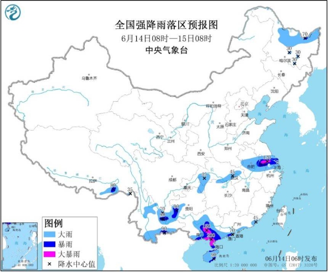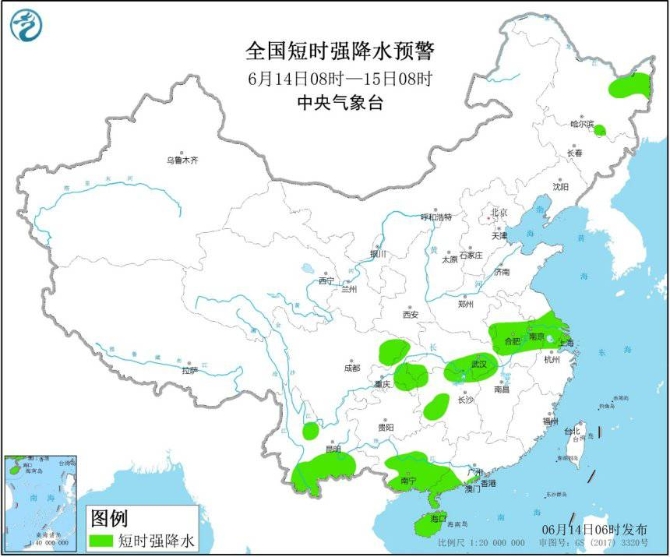 中央气象台6月14日06时继续发布暴雨黄色预警,预计,6月14日08时至15日08时,广东南部沿海、广西中南部、海南岛、云南中东部、江苏南部、安徽中部、湖北南部、以及黑龙江中北部、西藏东南部等地有大到暴雨,其中,广西东南部、广东西南部、江苏南部等地的部分地区有大暴雨(100~200毫米)。上述部分地区伴有短时强降水、雷暴大风等强对流天气,最大小时降雨量30~50毫米,局地可超过70毫米。