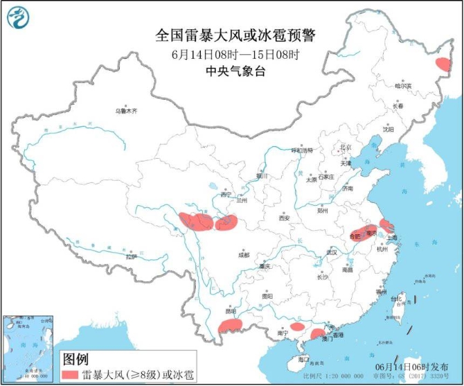 中央气象台6月14日06时继续发布强对流天气蓝色预警,预计6月14日08时至15日08时,黑龙江东部、江苏南部、安徽中南部、青海东南部、川西高原北部、云南南部、广西东部、广东西南部等地的部分地区将有8-10级雷暴大风或冰雹天气;黑龙江东部、江苏中南部、安徽中南部、湖北东部和南部、湖南西部和北部、四川东北部、重庆、云南中南部、广西中南部、广东西南部、海南岛等地的部分地区有短时强降水天气,预计小时雨量30-50毫米,局地可达70毫米以上。