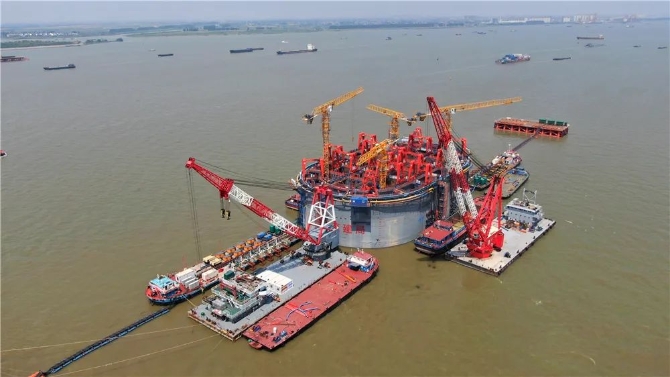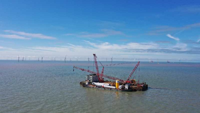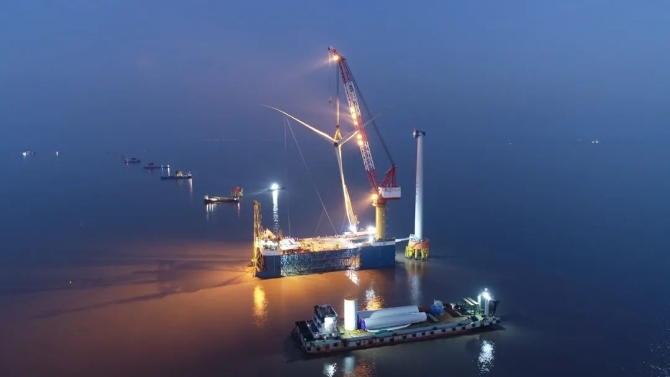 我国首个中外合资海上风电项目,东台五期风电项目与已并网投产的东台四期风电项目是国家能源集团国华投资公司与法国电力公司合作的新能源合资项目,位于江苏东台黄海海域,离岸直线距离约40千米,涉海面积约78平方千米。项目复工后,各项重点工作和施工有序推进。东台四期项目是目前我国已投产发电离岸最远、综合施工难度最高的海上风电项目。6月10日,东台五期竹根沙H1#风电项目首台风机塔筒、轮毂、机舱等组件从码头发运,预计6月中旬完成吊装。