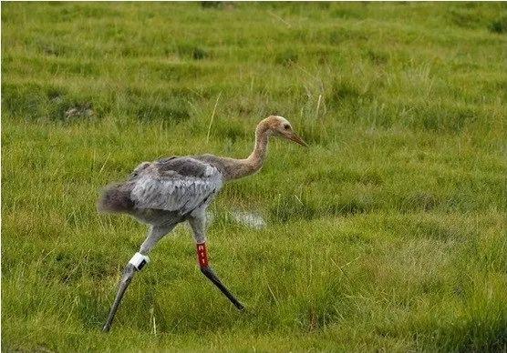 ▲环志后释放的黑颈鹤幼鹤,右腿佩戴红色彩环