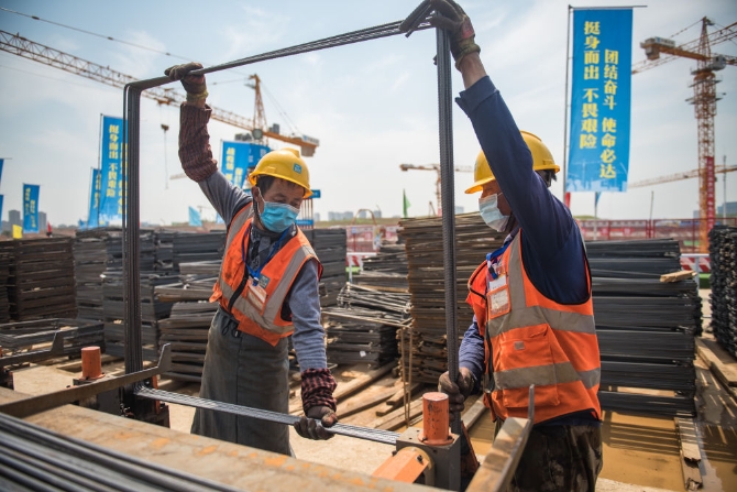 4月28日,中建三局的建设者在湖北武汉光谷大悦城建设工地作业。(新华社记者肖艺九摄)