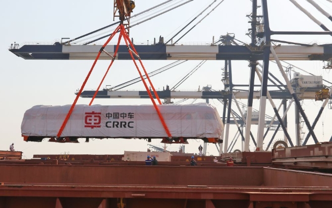 由中国中车股份有限公司出口几内亚的内燃机车在山东港口集团烟台港装船准备发运(3月30日摄)。新华社发(唐克 摄)