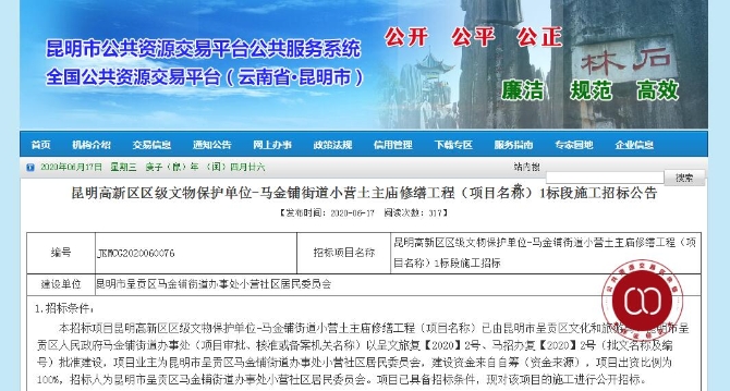 6月17日,昆明市公共资源交易平台于发布《昆明高新区区级文物保护单位-马金铺街道小营土主庙修缮工程(项目名称)1标段施工招标公告》。